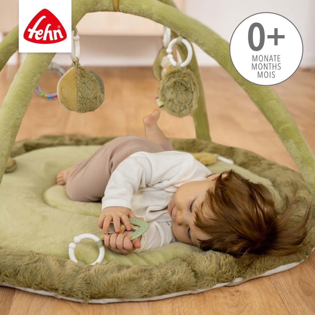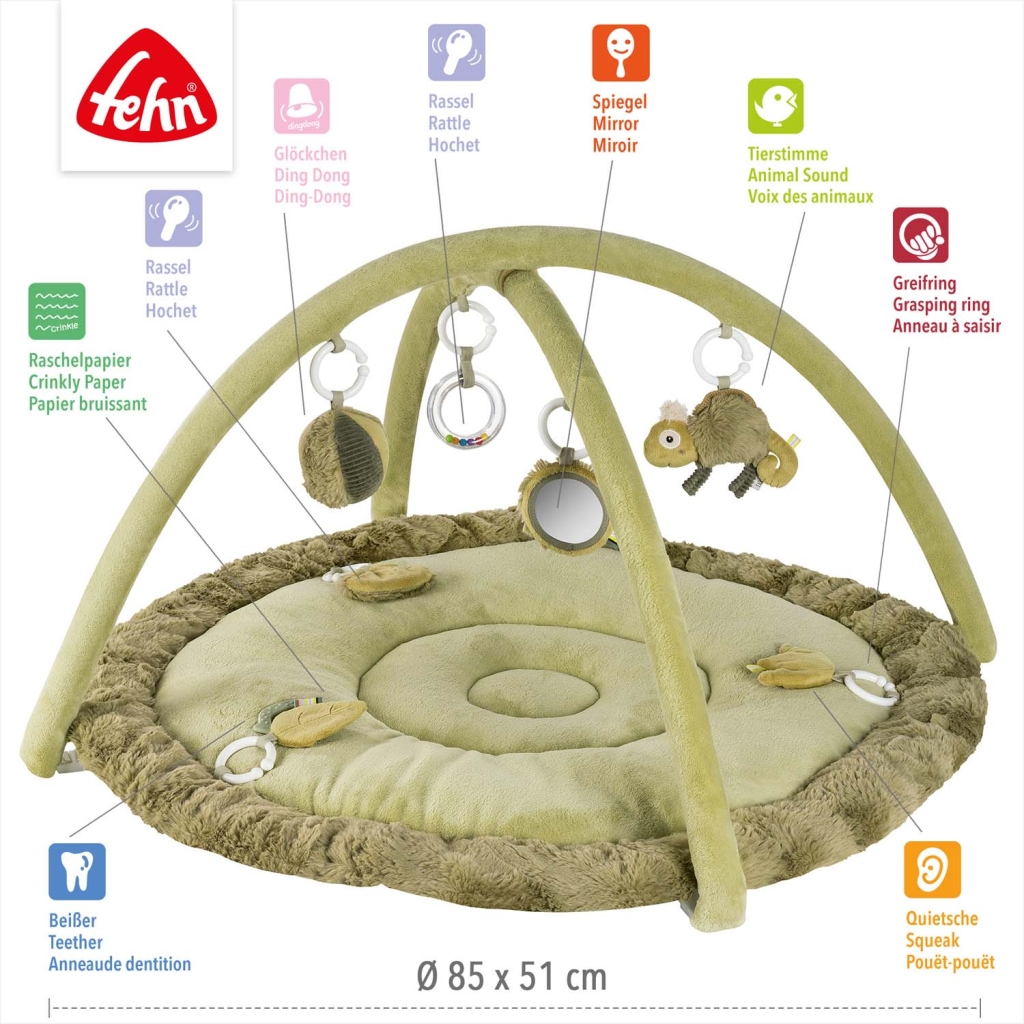 Interaktivní deka s chameleonem a prostorem na ležení z různých hebkých materiálů láká miminko k mazlení, zkoumání a hraní. Tři odnímatelné prvky se šusticím papírem, pískátkem a chrastítkem na dece podporují hmatové vnímání a koordinaci oko–ruka.