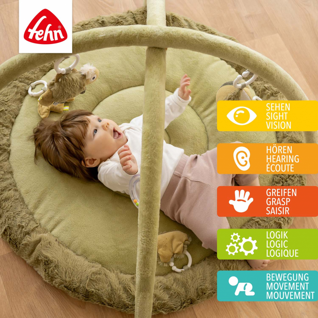 Na dvou hrazdičkách jsou zavěšeny další hračky: chrastítko s kroužky, skrytá rolnička v míčku, zrcátko a chameleon se zvířecím zvukem. Tyto prvky upoutají pozornost dítěte, prodlouží dobu soustředění a přinesou radost ze hry.