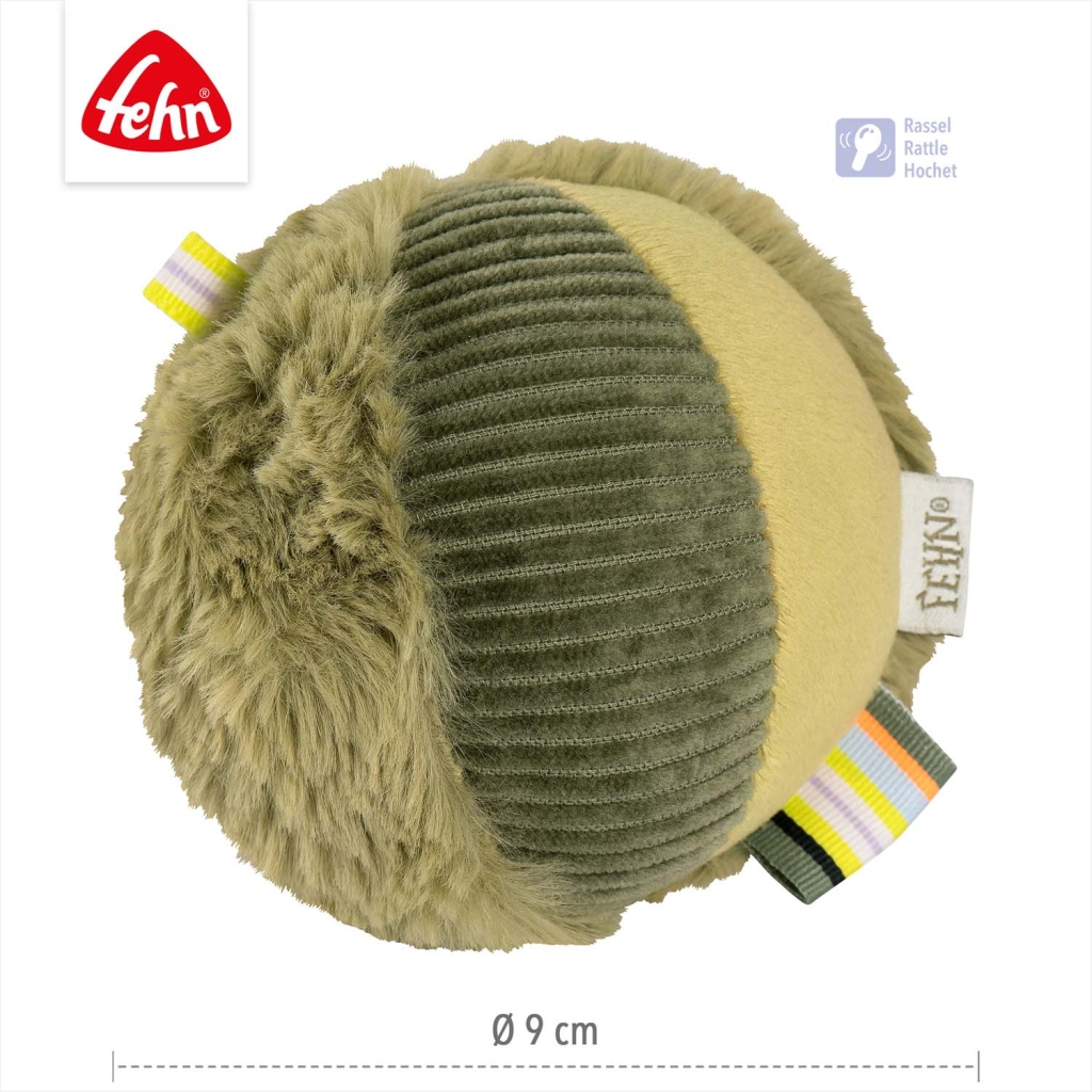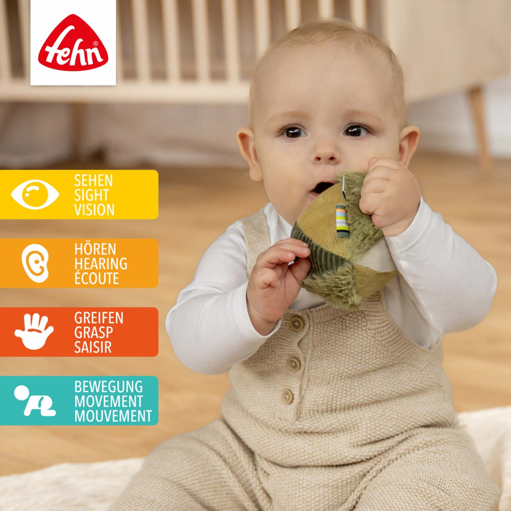 Zajímavá kombinace použitých materiálů stimuluje hmat, podporuje cílený úchop a láká ke zkoumání a hraní. S tímto míčkem nebude společné hraní nikdy nuda.