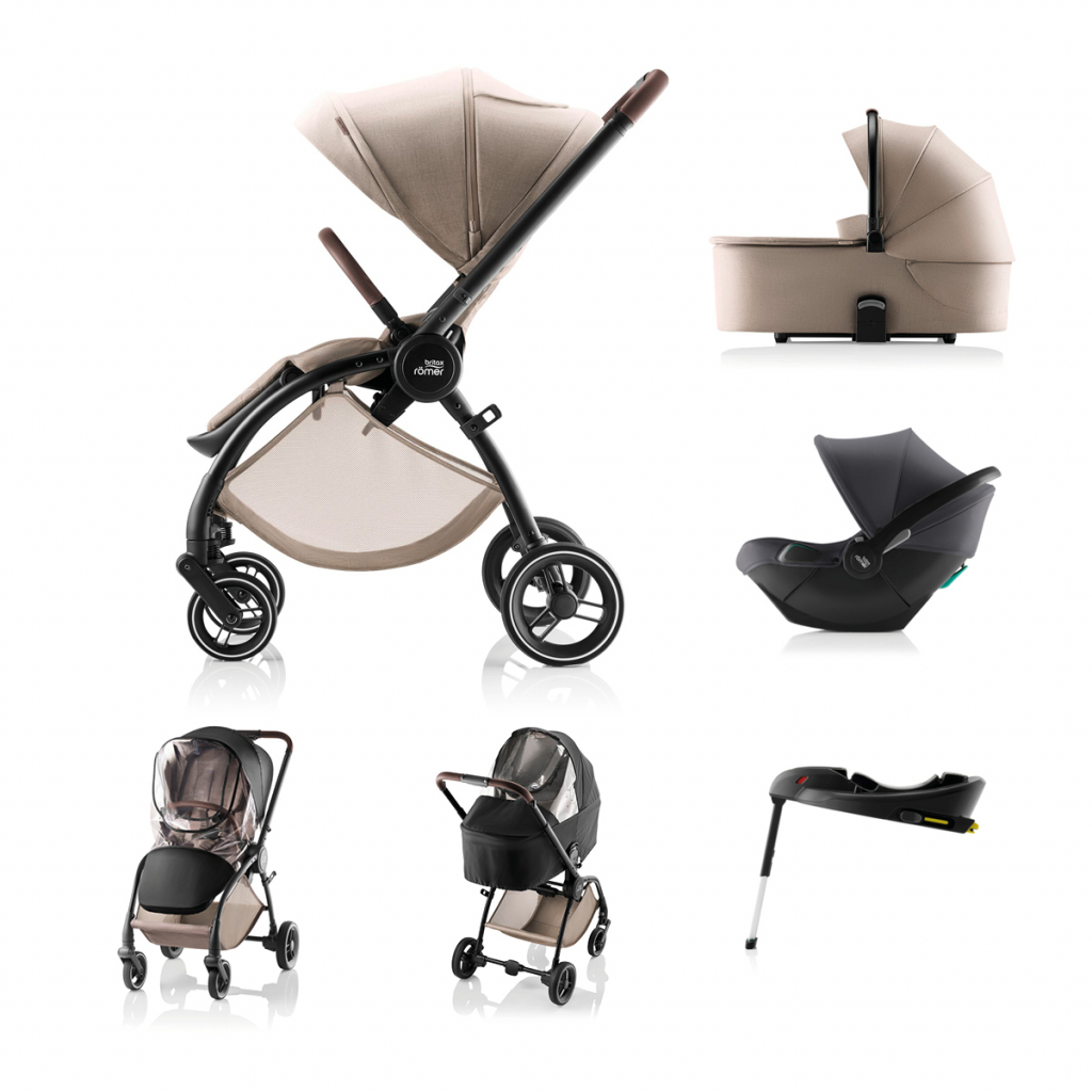 Sportovní kočárek Britax Römer Rio, hlubokou korbu Britax Römer Rio, autosedačku Baby-Safe Core, základnu Baby-Safe Core Base, pláštěnku na kočárek Rio a pláštěnku na hlubokou korbu Rio.