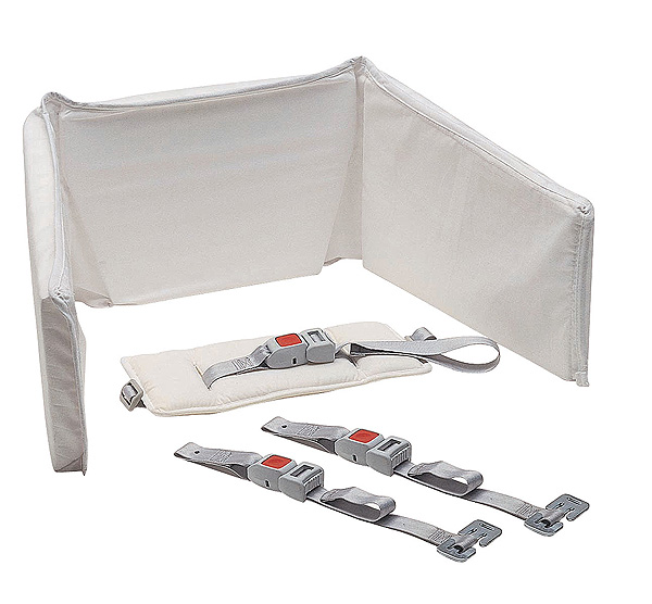Sada pro bezpečné upoutání a přepravu miminka v hluboké korbě kočárku na zadním sedadle vozu místo autosedačky.