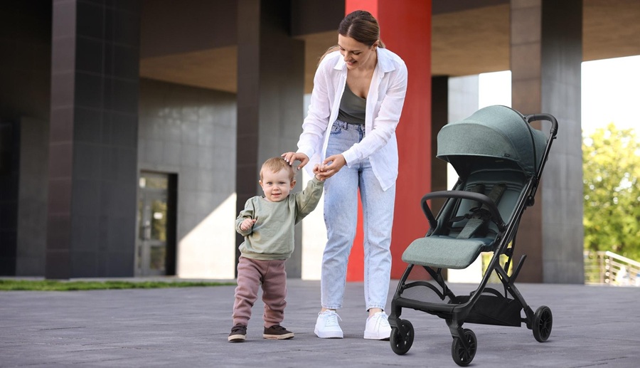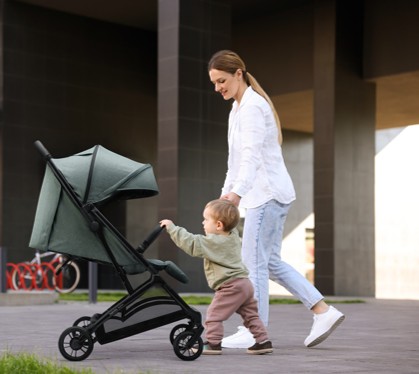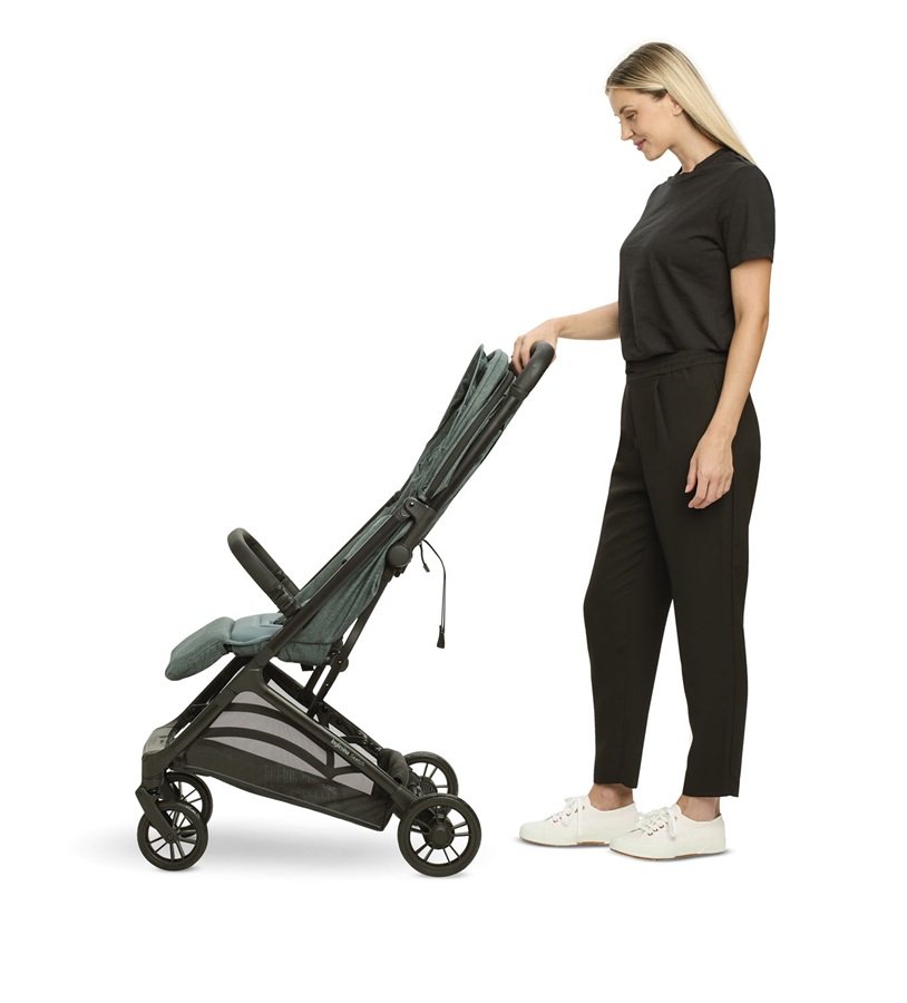- Rozloží se a složí jen jednou rukou a zůstane stát sám rukojetí vzhůru, pro zajištění maximální hygieny se po složení kočárku nic nedotýká země.