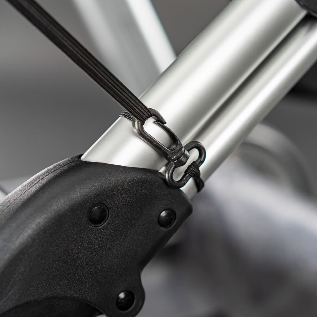 Elastické pásky umožňují flexibilní zapínání, protože se individuálně přizpůsobí jakékoli velikosti a tvaru. Montážní háčky zajišťují potahu bezpečné držení, protože umožňují snadné a spolehlivé připevnění i na rám kočárku.
