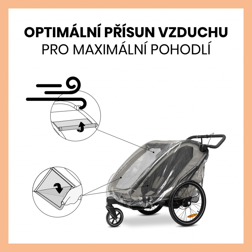 Díky odolnému, nepromokavému materiálu (100% PEVA) zůstanou vaše děti uvnitř cyklovozíku v suchu i při silném lijáku. Zároveň může dovnitř volně proudit vzduch větracími otvory – a pláštěnka se tak nemlží.