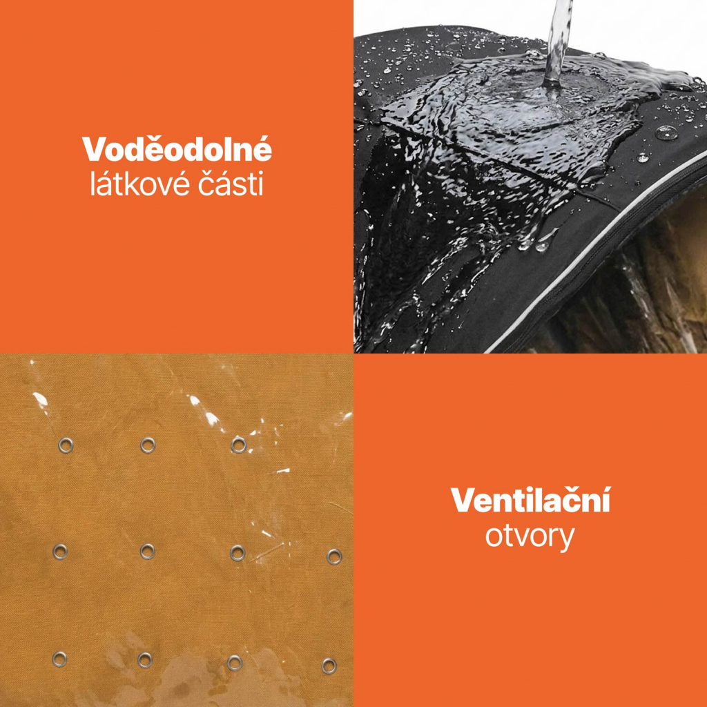 Odolný voděodolný materiál spolehlivě chrání před nepříznivým počasím, zatímco pevná konstrukce drží tvar i při silném dešti.