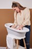 Velmi stabilní vanový stojan Sense má nohy vyrobené z lakovaného bukového dřeva s certifikací FSC. To dodává stojanu teplý moderní vzhled. Je vybaven praktickými pomůckami; vpředu je připevněn držák na ručníky. Prostorná plastová polička poskytuje dostatek místa například pro šampon, žínku, vodní hračky nebo koupací gel. To znamená, že máte po ruce všechny potřebné věci, abyste si s malým mohli v klidu koupání užít. Inovativní systém upevnění zajišťuje, že vanu lze snadno připevnit ke stojanu a stejně snadno sejmout. Po kliknutí můžete své miminko nerušeně a bezpečně koupat.