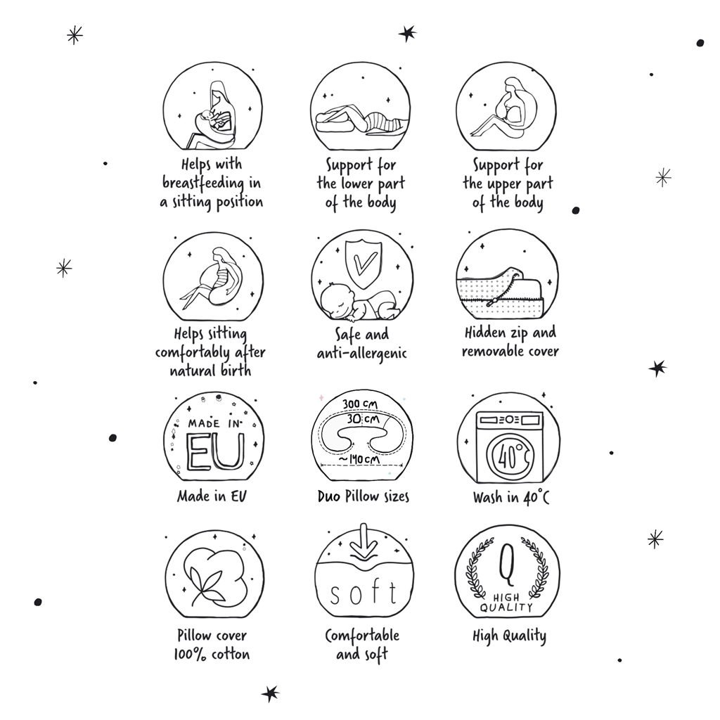 Důležité: Před každým použitím vždy zkontrolujte stav polštáře, aby byla zajištěna maximální bezpečnost a pohodlí pro vás i vaše dítě.