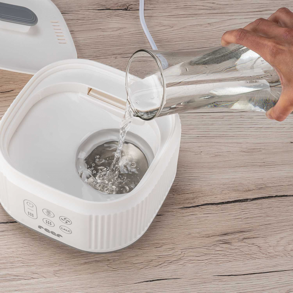 Pro správně použití by měly být jednotlivé části a nerezová deska po každém použití očištěny od zbytkové vody. To zabrání tvorbě vodních skvrn a vodního kamene. Parní nádobu, košík na malé předměty a víko lze v případě velkého znečištění snadno umýt v myčce. Pro spolehlivé čištění nerezové desky je integrována přídavná funkce odvápnění, kterou vám spotřebič automaticky připomene po každých 25 použitích. Odvápnění se provádí bez použití čisticích prostředků nebo přidání jiných chemikálií – pouze za použití vody a octa.