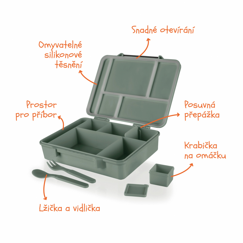 Díky několika prostorným přihrádkám různých velikostí (500 ml, 330 ml, 220 ml, 150 ml a 130 ml) můžete připravit pestrý a vyvážený oběd s sebou. Malá nádobka na omáčku a integrovaná vidlička se lžičkou jsou samozřejmostí.