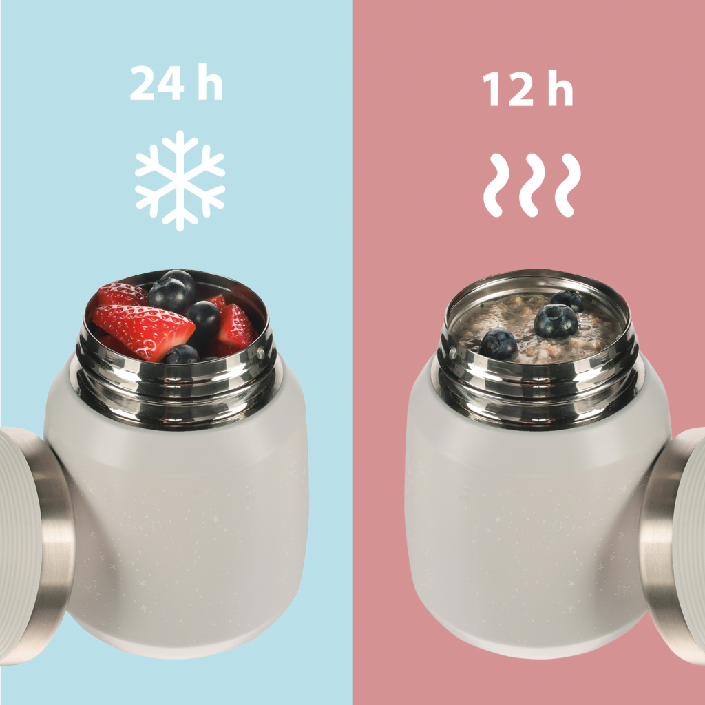 Kvalitní termoska na jídlo a příkrmy o objemu 300 ml uchovává horké jídlo až 12 hodin, studené až po dobu 24 hodin. Je vyrobena z kvalitní nerezové oceli, která je odolná vůči korozi. Těsné víčko zajišťuje, že termoska neprotéká. Díky vakuové izolaci se termoska při naplnění horkým obsahem nezahřívá z venku.
