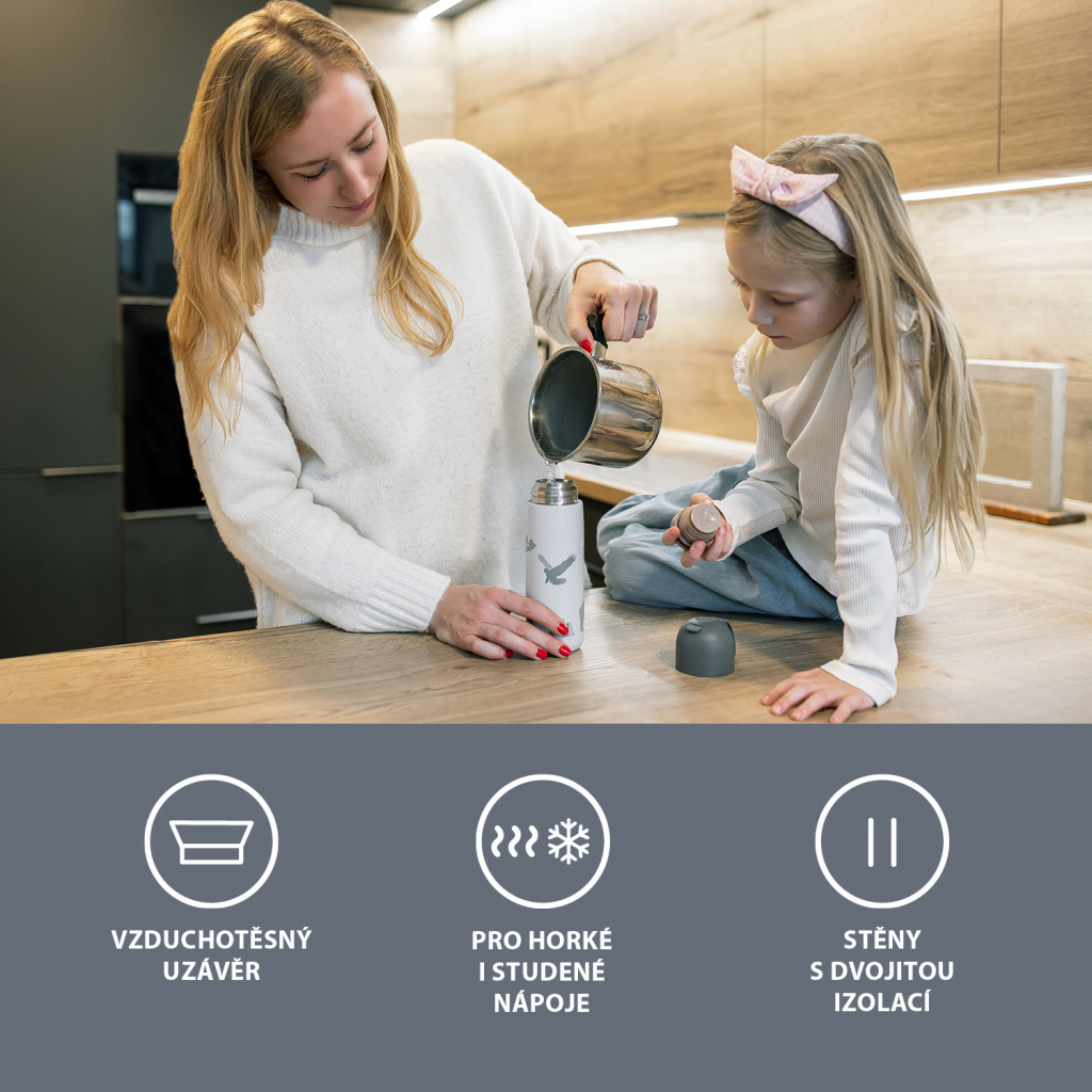 Kvalitní termoska na tekutiny o objemu 400 ml uchovává horké nápoje až 12 hodin, studené až po dobu 24 hodin. Je vyrobena z kvalitní nerezové oceli, která je odolná vůči korozi. Těsné víčko zajišťuje, že termoska neprotéká a vrchní uzávěr pro pohodlné nalévání se postará o to, abyste se nepolili ani při jízdě autem na nerovné cestě, taktéž si můžete být jisti, že se dítě neopaří tekutinou z termosky vzhledem ke dvojitému uzávěru. Víčko termosky lze použít jako hrníček.