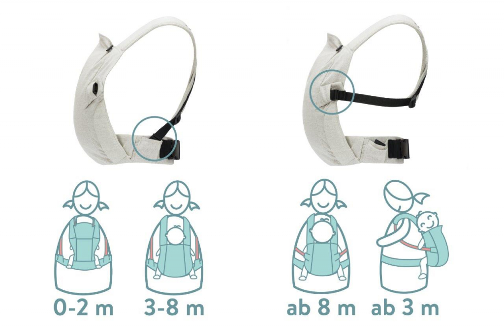 Až bude vaše sluníčko starší, můžete nosič použít i jako nosič na záda. Díky snadno přístupným přezkám na bederním pásu a klopám lze nosič nasadit i sám bez pomoci. Lze použít jako zádový nosič. Lze prát v pračce. Včetně odnímatelné opěrky hlavy.