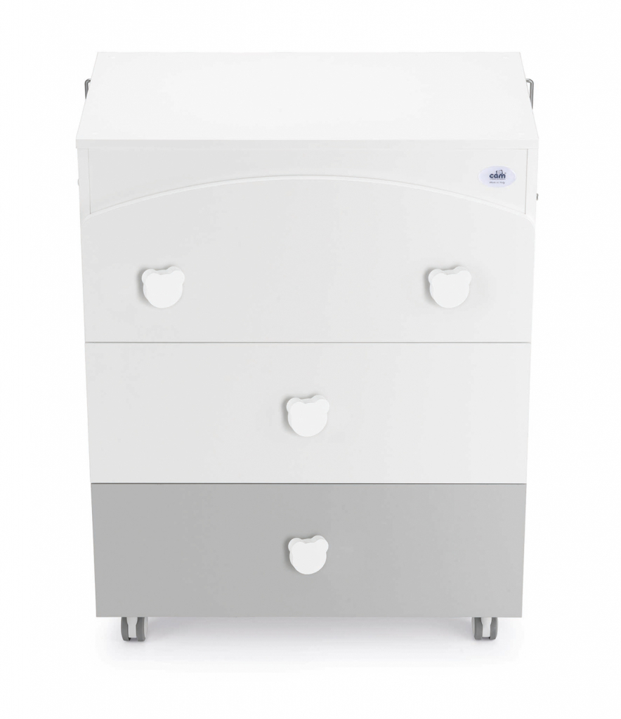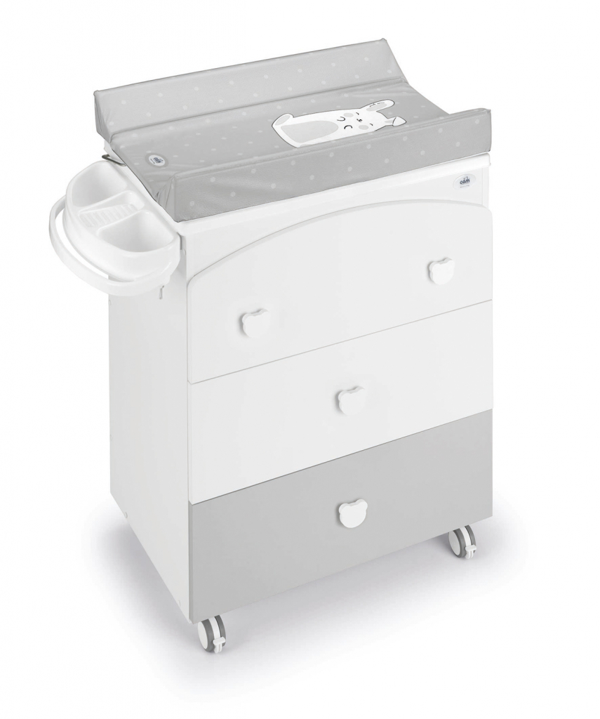 Komfort dítěti zajišťuje měkká vyklápěcí přebalovací podložka s bezpečnostním systémem. Komoda je také vybavena vaničkou se 2 anatomickými sedátky (jedna opěrka pro miminka od 0 do 6 měsíců a druhá s područkami pro děti od 6 do 12 měsíců) a držáky na houbu a mýdlo. Úložný prostor řeší 3 prostorné zásuvky s kovovými pojezdy, kam snadno uložíte všechny nezbytnosti. Díky dřevěné desce lze přebalovací stůl snadno přeměnit na stylovou komodu, kterou můžete využívat i po skončení přebalovacího období. Manipulaci usnadňují čtyři kolečka, z nichž dvě jsou vybavena brzdami pro zajištění stability a bezpečí.