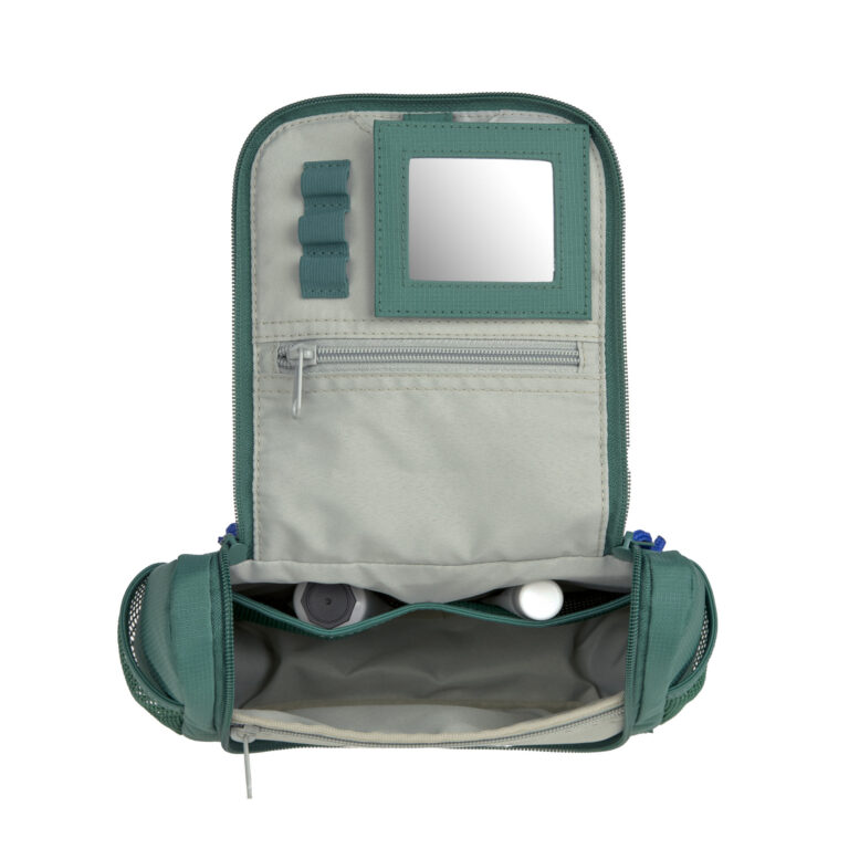obrázek na přední straně washbagu, který je možné přichytit pomocí patentky