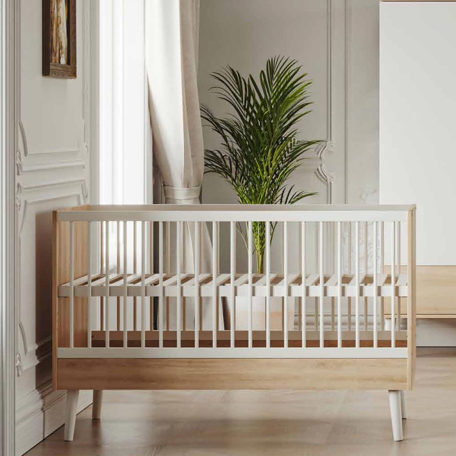 Dětská postýlka Cardiff vyrobená z laminované dřevotřísky s povrchem provedeným v dezénu Španělský dub, s bílými bočnicemi a s roštem z masivu.
