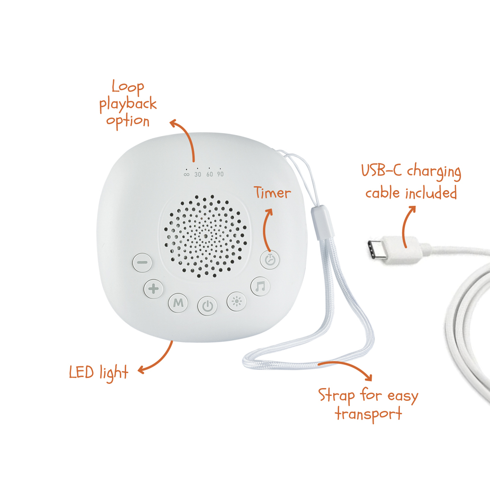 Kompaktní a stylový pomocník pro klidné usínání miminek i větších dětí. Nabízí až 20 variant bílého šumu, jemné LED osvětlení s měnícími se barvami, časovač a praktické poutko pro zavěšení. Ideální pro použití doma i na cestách.